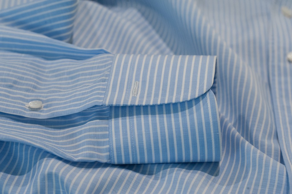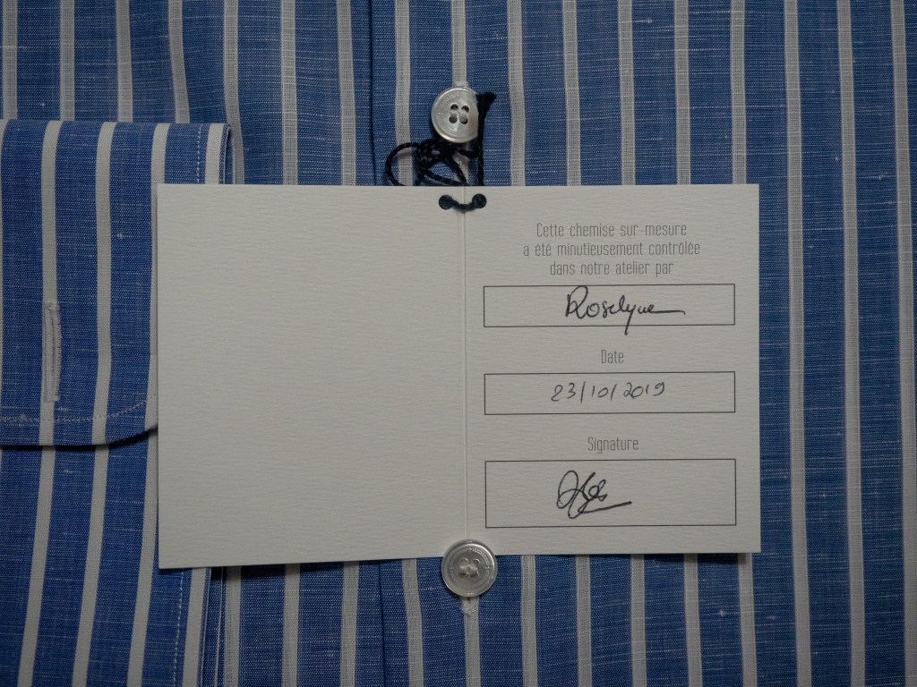 Pour le reste de la conception de la chemise, le type de poignets ne varie presque jamais avec moi, poignet tailleur uniquement. En revanche nous avons eu deux discussions intéressantes à propos du col. Tout d’abord, quel col choisir ? J’hésitais à me laisser tenter par le malin, pardon par un col boutonné, très en vogue et plutôt recommandé pour une chemise estivale pouvant être portée sans cravate. Pourtant Daniel me répond que dans un tel contexte, un col cutaway (très ouvert) peut aussi être une excellente alternative. Intrigué par cette remarque qui sort de ce qu’on peut lire un peu partout (et ravi à l’idée de m’éviter de faire la même chose que tout le monde) j’opte donc pour le col ouvert ! Vient ensuite le moment le plus intéressant de cette commande. Alors que nous discutons du col je précise avec baleines amovible (évidemment me diras-tu), mais c’est alors que Daniel me dit que ce n’est pas si évident que ça, en particulier parce qu’il connaît bien son atelier, et que lorsque les baleines ne sont pas amovibles, celles-ci sont avancées un peu plus afin d’être cousues avec le col. Cela permet d’éviter qu’elles bougent avec le temps, mais aussi (et c’est là que ma curiosité s’éveille) que la pointe de col ne rebique. Et ça… c’est un argument coup de poing ! J’irai donc sur des baleines non amovibles, en désaccord total avec l’ensemble de la sphère sartoriale, pour mon plus grand plaisir.