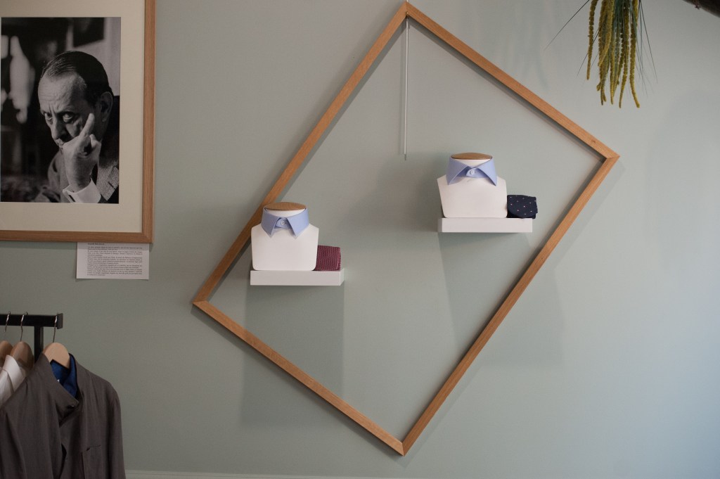 Mais ce n’est pas tout ! Ce serait trop simple. Après tout, Daniel Lévy faisant fabriquer ses chemises par un atelier, tous ces avantages ne peuvent suffire à eux seuls à justifier un achat, ils ne sont pas assez différenciants. Qu’est-ce qui fait qu’alors que le produit n’est pas exclusif, on vient précisément le chercher ici ? Eh bien c’est avant tout une question d’expérience client. On est fidèle à une boutique/marque parce que l’univers qui a été créé pour la promouvoir nous correspond, parce que le relationnel avec le créateur est aisé, et que sa vision du style est en accord avec la nôtre, ce qui permet de trouver ce qu’on cherche, à tous les coups. Et c’est exactement ce qui se passe lorsqu’on entre chez Daniel Lévy. L’endroit est charmant, élégant, sophistiqué sans trop en faire. La décoration fait la part belle au produit, mais aussi à de magnifiques photos noir et blanc rappelant à la fois l’histoire du lieu (ancienne galerie d’art je le rappelle), mais aussi le fait que l’élégance ne passe pas que par une chemise bien ajustée, mais aussi par la culture. J’ajoute enfin que même si le made in France est ici totalement assumé, valorisé et porté en étendard, il n’en est pour autant ni dogmatique ni snob (contrairement à un certain nombre de marques, même bas de gamme…) , mais promu avec panache, comme le prouve le coq majestueux qui trône en plein milieu de la boutique. Il faut faire de la chemise made in France parce que c’est beau, et parce qu’elle a son histoire (il est bon de rappeler qu’avant la maison de luxe, Jeanne Lanvin était chemisière).