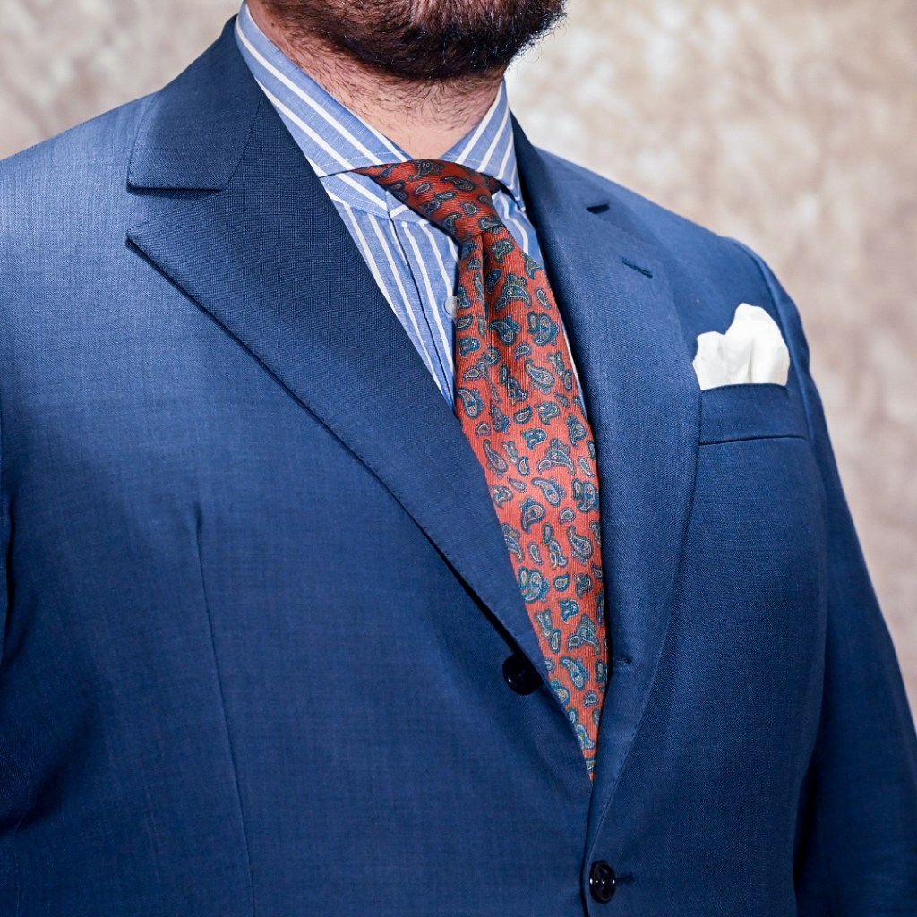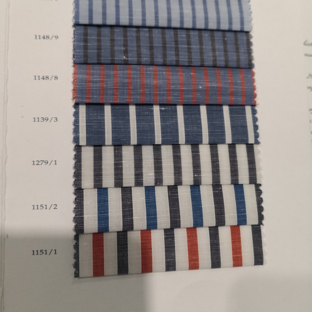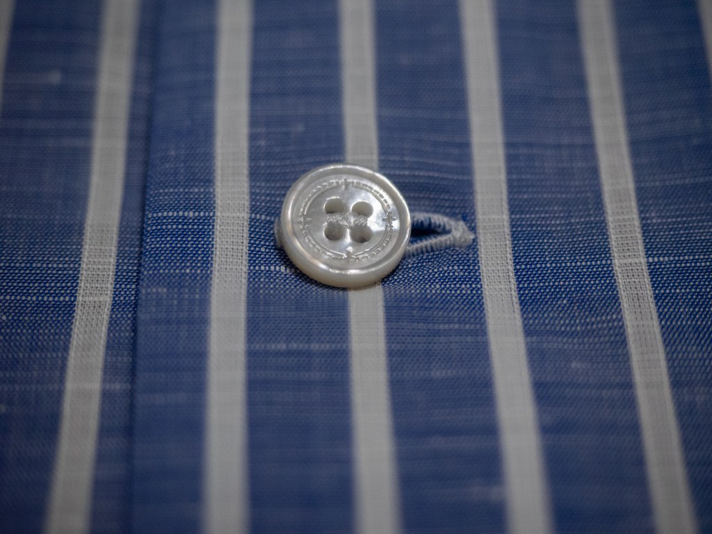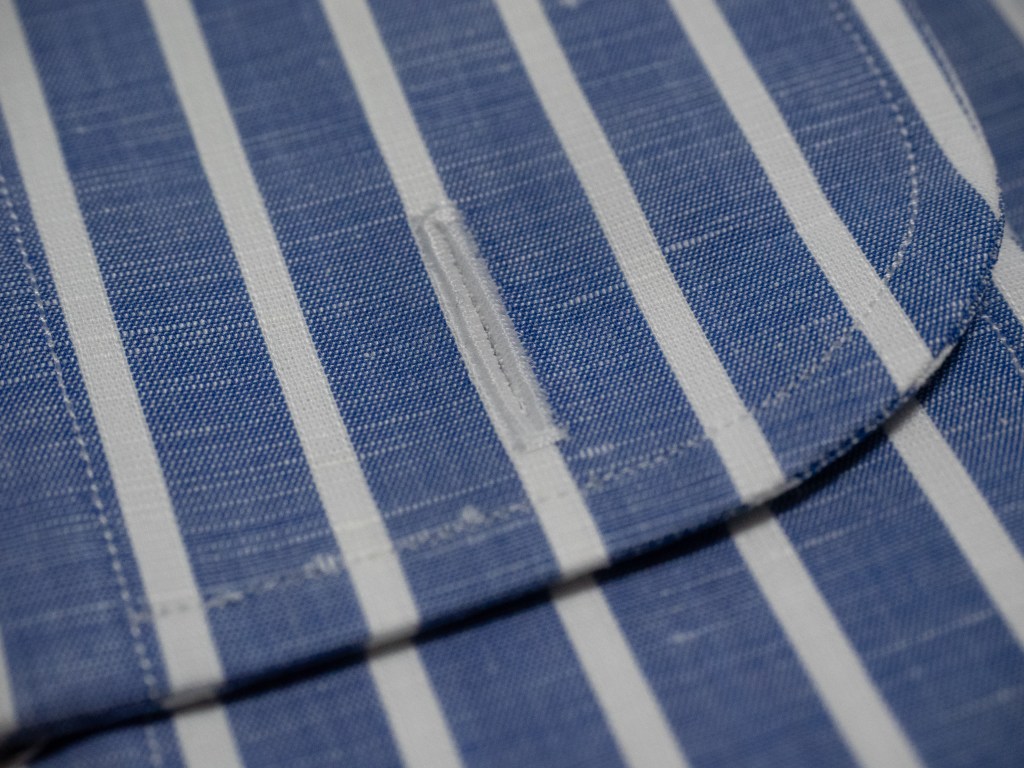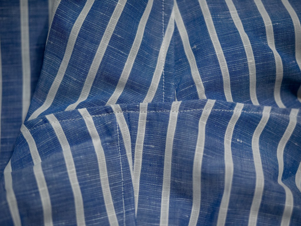 A l’époque de la commande (et encore maintenant), mes envies se dirigeaient vers : des tissus portables l’été, des rayures pas trop sobres, une attirance sans bornes pour le lin. Très rapidement Daniel m’a orienté vers les liasses de tissus mélangés coton et lin de la maison S.I.C.TESS. Peu connue même chez les amateurs, S.I.C.TESS. est une marque de tissus fondée en 1924 avec un seul but fabriquer les meilleurs tissus de chemise. Près de 100 ans après, elle est devenue la marque haut de gamme du groupe Monti. J’avais déjà fait faire une chemise dans un magnifique oxford de la même maison, et ai donc jeté mon dévolu sur une rayure bleue assez classique quoique bien large. Autant le dire tout de suite, ce tissu est une merveille.