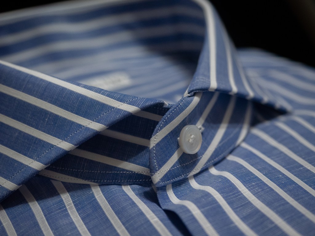 Le cas de la chemise est plus complexe. Il faut réussir à accorder couleur, motifs et tissus. Pour les tissus, il y a de quoi faire l’été, que ce soit le lin, le seersucker, le mélange coton-lin, le giro inglese (qu’on retrouve sur les liasses italiennes sous le nom de cellulare) …. J’élimine le blanc, ça ne me dit rien comme ça, trop simple peut-être (même si mon ami Gilles prétend que faire simple c’est bien), et le bleu ciel (trop business), reste les rayures. Cela tombe sous le sens si tu as lu mon article précédent, je dois porter ma chemise Daniel Levy. Elle a tout pour, le tissu, ce mélange coton lin exceptionnel, ses rayures bleues un peu larges pas trop formelles, son col cutaway et ses poignets tailleurs, bref, la chemise parfaite.
