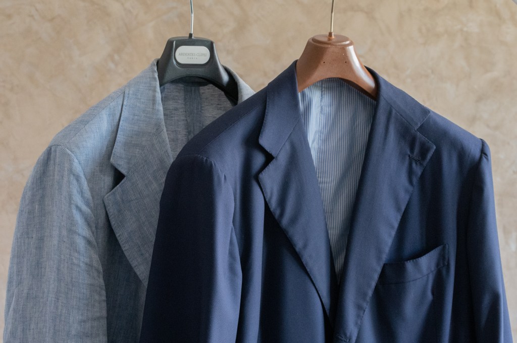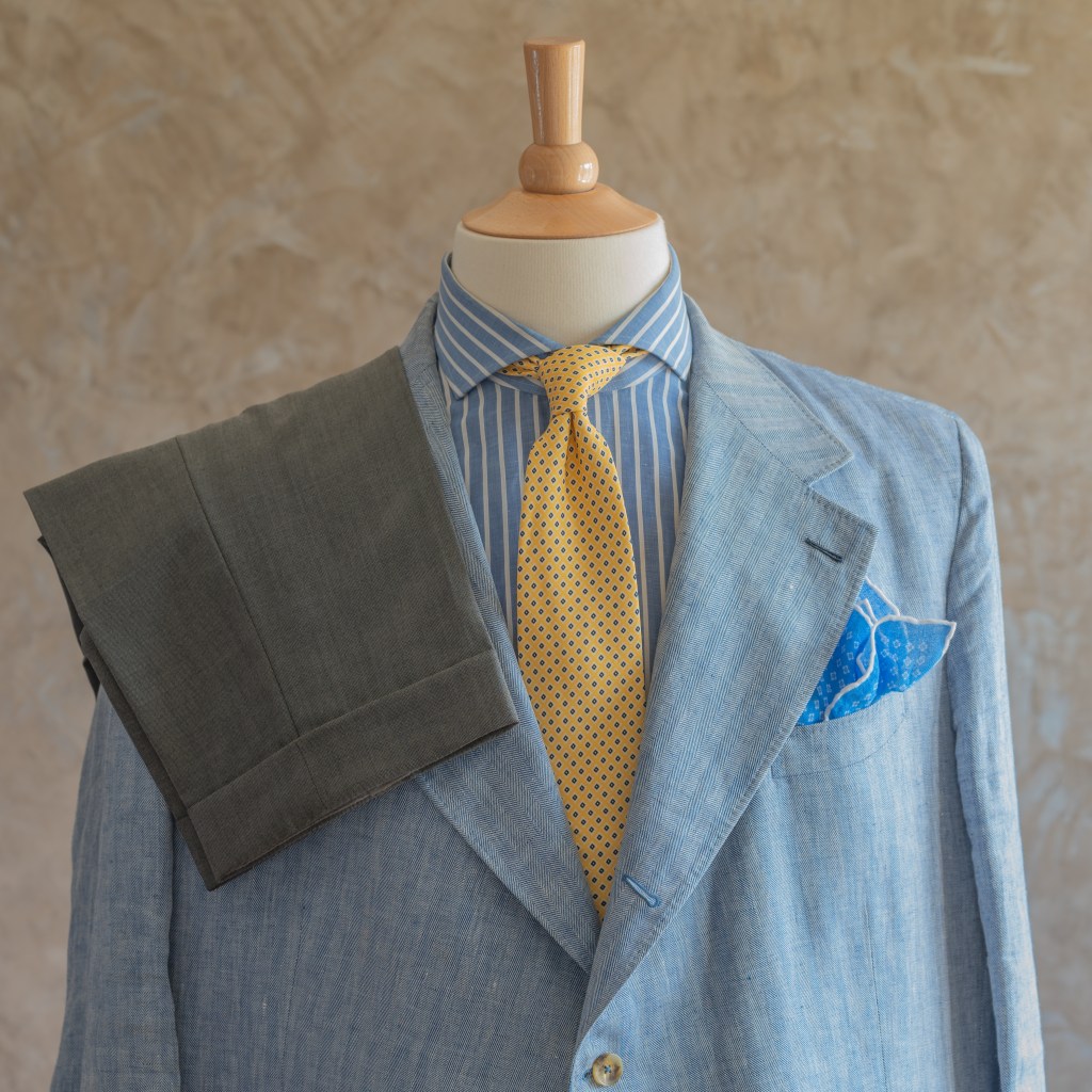 Pour la veste, les choses se corsent. Initialement j’envisageais de porter la veste de mon costume Ciardi, qui aurait été très bien. Mais comme c’était ma première veste en mesure (demi ou grande) elle est entièrement doublée et le tissu sans être chaud n’est pas particulièrement léger. J’étais convaincu de ce choix jusqu’à une dizaine de jours avant le mariage, lorsque les températures ont largement dépassé les limites acceptables par le corps humain. J’ai dû me rendre à l’évidence choisir cette veste, c’était risquer de souffrir toute la journée. Après réflexion, je lui ai préféré un autre blazer, provenant aussi de la maison Ardentes Clipei. C’est un blazer en lin à chevrons bleu clair, à revers larges et poches plaquées. Il est non doublé et totalement déstructuré, c’est-à-dire qu’il n’y a ni doublure, logique, ni entoilage, ni padding, comme toute veste déstructurée qui se respecte (et contrairement à beaucoup de vestes du commerce vendues comme telles), mais j’ai été encore plus loin ! Bien que beaucoup (tous ?) de tailleurs le déconseillent, j’ai demandé à ce qu’il n’y ait pas de doublure dans les manches non plus. Entendons-nous bien, si les tailleurs en mettent d’office, comme ils conseillent d’avoir un peu de doublure au moins aux épaules, c’est avant tout pour aider à la fluidité de la veste. Sans ces tissus internes, le tissu de la veste risque de frotter celui de ta chemise et ne pas glisser comme il faudrait. La matière soyeuse des doublures (en général de la viscose) va glisser sur la chemise et la veste tombera bien mieux. Fais donc attention lorsque tu demandes une veste non doublée. Alors bien sûr j’aurais préféré une veste bleu marine, mais celle-ci correspond plus au contexte champêtre, et aux températures (je n’imagine pas tomber la veste).