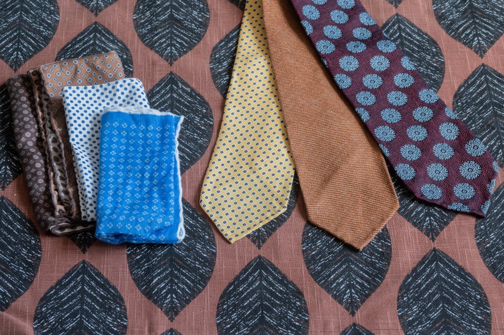 Lorsque je voyage, j’emporte toujours plusieurs options de cravates et pochettes. J’aime à croire qu’il faut qu’il y ait quelque chose d’un peu improvisé sur le choix de ces pièces. Ce sont elles qui vont faire tout le sel de la tenue, qui vont orienter la lecture que les liseurs pourraient en avoir. Elles doivent aussi correspondre à mon humeur du jour, à mon avis du moment à tout et n’importe quoi. Je pars donc avec 3 cravates, une en lin marron de Patrizio Cappelli (une de mes préférées, si ce n’est la numéro 1), une en grenadine bordeaux à gros motifs turquoise de Stefano Cau et une cravate en soie jaune à petits motifs géométriques bleu marine de chez Calabrese.