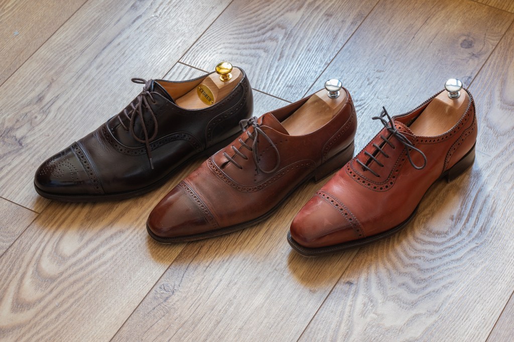 Pour les souliers, le cahier des charges bien qu’assez strict est finalement assez facile. Un richelieu marron à bout droit. Finalement ça représente une partie non négligeable de mes souliers (du classique cap toe au half-brogue…). Idéalement la forme doit être un carré atténué (si tu ne visualises pas, regarde la forme 348 de Crockett & Jones, voilà, c’est ça). Idéalement, dans le vestiaire de mes rêves, cette paire de souliers ce serait une paire de Gaziano & Girling St James II avec une jolie patine marron, assez légère, un peu dans le genre de ce qu’avait réalisé Samuel Norsworthy pour le championnat du monde de patine en 2019. Bon, trêve de bavardages, un autre point est important. Un mariage c’est long, il faut chaud, on est longtemps debout. Il me fallait donc une paire en laquelle j’ai toute confiance pour ce genre d’aventure. Soit mon richelieu half-brogue Tricker’s marron foncé, soit un modèle dessiné par le marié à l’occasion d’une commande groupée il y a quelques années. Les Tricker’s sont trop foncées, et la forme trop ronde. Va pour les secondes !