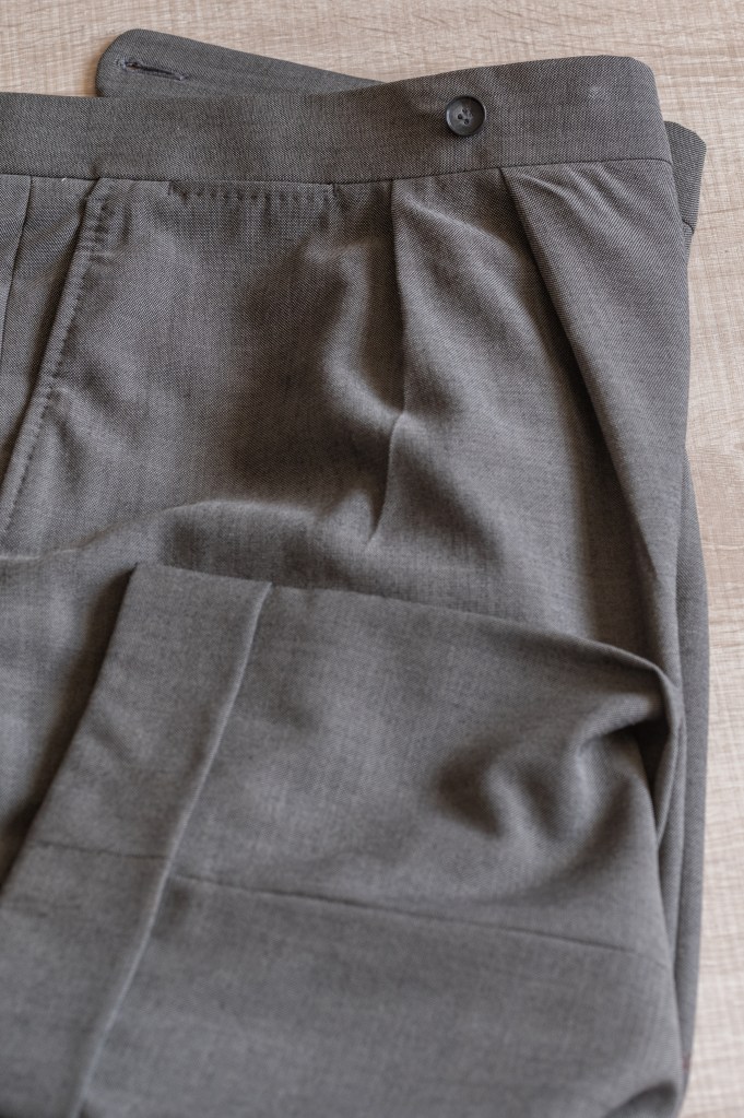 Pour le pantalon, c’est très simple. Il se trouve que pour les périodes chaudes j’ai un pantalon en fresco gris moyen. Il sera idéal (j’en ai même deux tellement ce tissu est idéal). Le fresco c’est un de mes tissus coup de cœur. Comme son nom l’indique c’est un tissu frais, créé par la maison Hardy Minnis. Il est pourtant 100% laine, d’un poids de 280g/m, et froisse peu. J’aime le fresco c’est certain, j’y ferais bien quelques pièces en plus (au moins un costume et un blazer…). Le pantalon est dans le même style que tous mes derniers pantalons, taille haute, ceinture décalée, poches américaines, revers de 5cm, double pince. Avec le temps j’affine mon style de pantalon parfait, et ils sont tous réalisés sur le même modèle. Majoritairement en demi-mesure chez mon ami Romain de la maison Ardentes Clipei. Ce pantalon c’est mon basique à moi, j’en aurais 12 ce ne serait pas gênant.