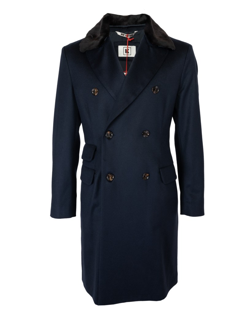 Ici aussi, la pièce est exceptionnelle. Un manteau croisé bleu nuit, version habillée du polo coat (on a la martingale mais une simple fente arrière, et des poches à rabat classiques), c’est très vu mais déstructuré et réalisé en cachemire Carlo Barbera, ça devient une curiosité fort exclusive, si tu as les moyens….
