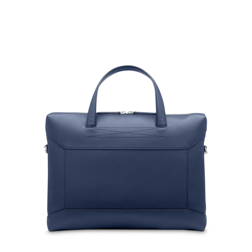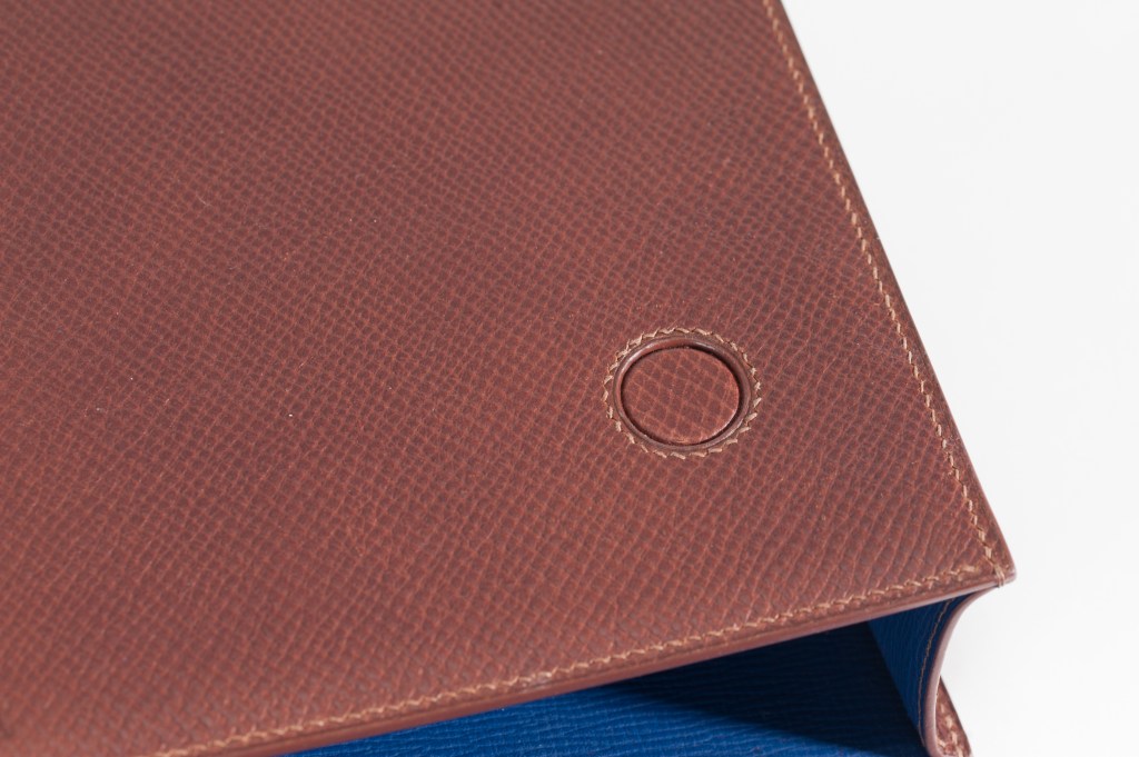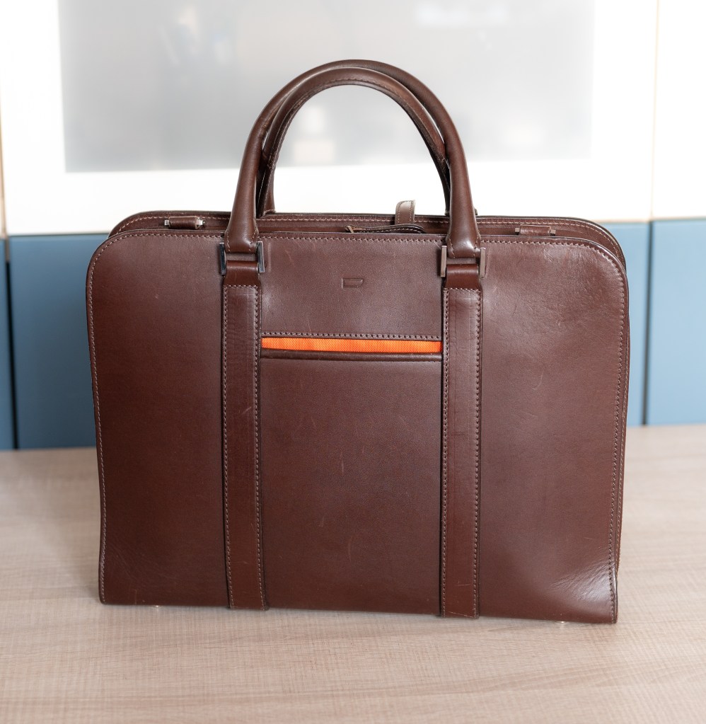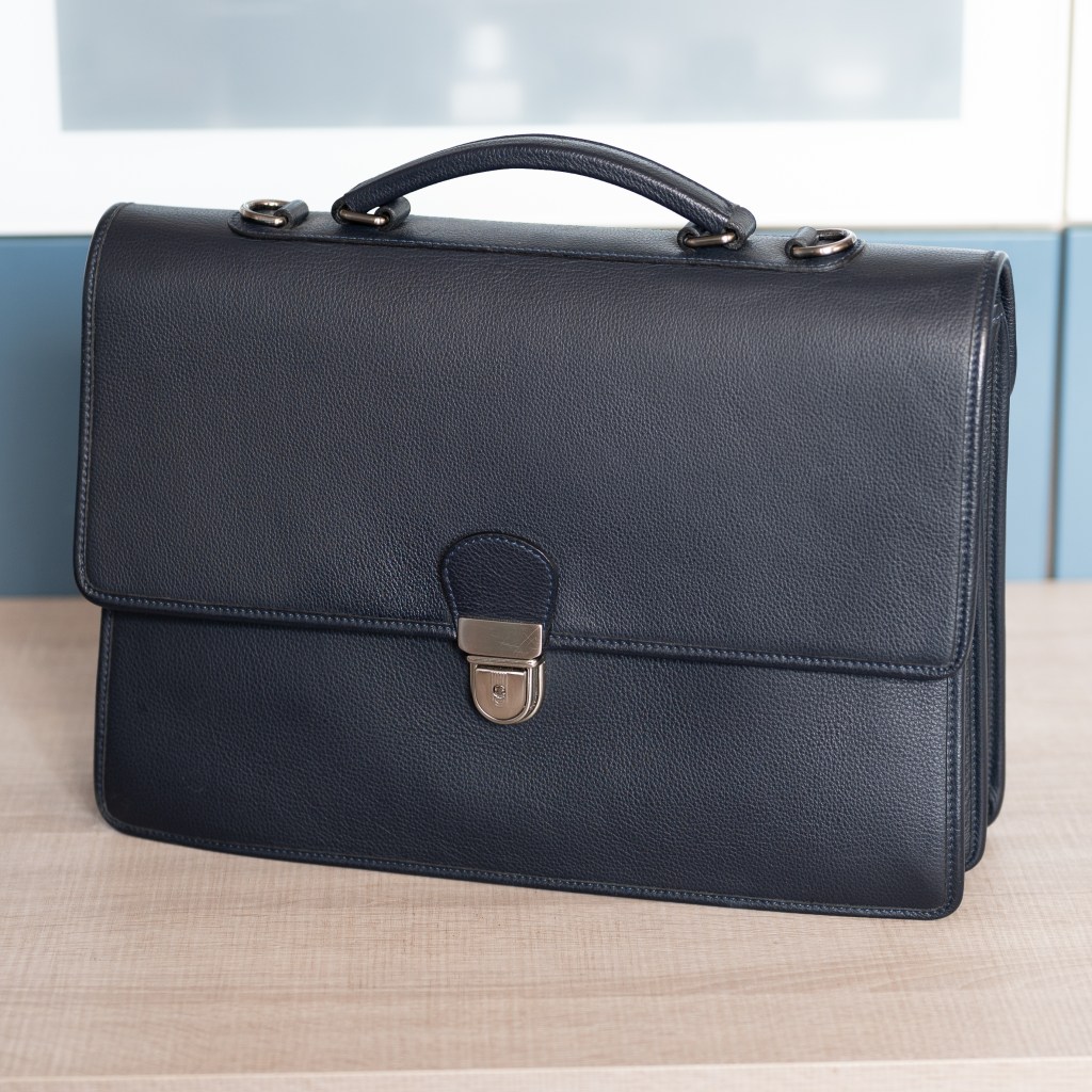 Bonino est une maison napolitaine avec qui j’ai travaillé il y a quelques années. Lors de ma première visite en 2014 je cherchais un cartable plutôt formel. Il y avait en stock des cartables très classiques à 1, 2 ou 3 soufflets, noirs ou marron. En discutant un peu avec xxxx Bonino et son père ils me disent que des commandes spéciales sont envisageables. Comme j’aime bien avoir quelque chose d’un peu exclusif, je décide de faire simple, en partant du modèle deux soufflets, auquel je ne modifie rien, mais pour lequel je choisis une peausserie bleue et une doublure en alcantara orange, histoire qu’il soit vraiment unique, tout en étant utilisable dans un contexte professionnel. Cela fait donc 8 ans que j’utilise ce sac, pas au quotidien, mais dans certains contextes ou juste lorsque j’ai envie, et j’en suis pleinement satisfait.