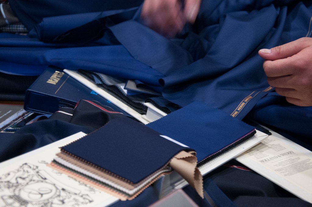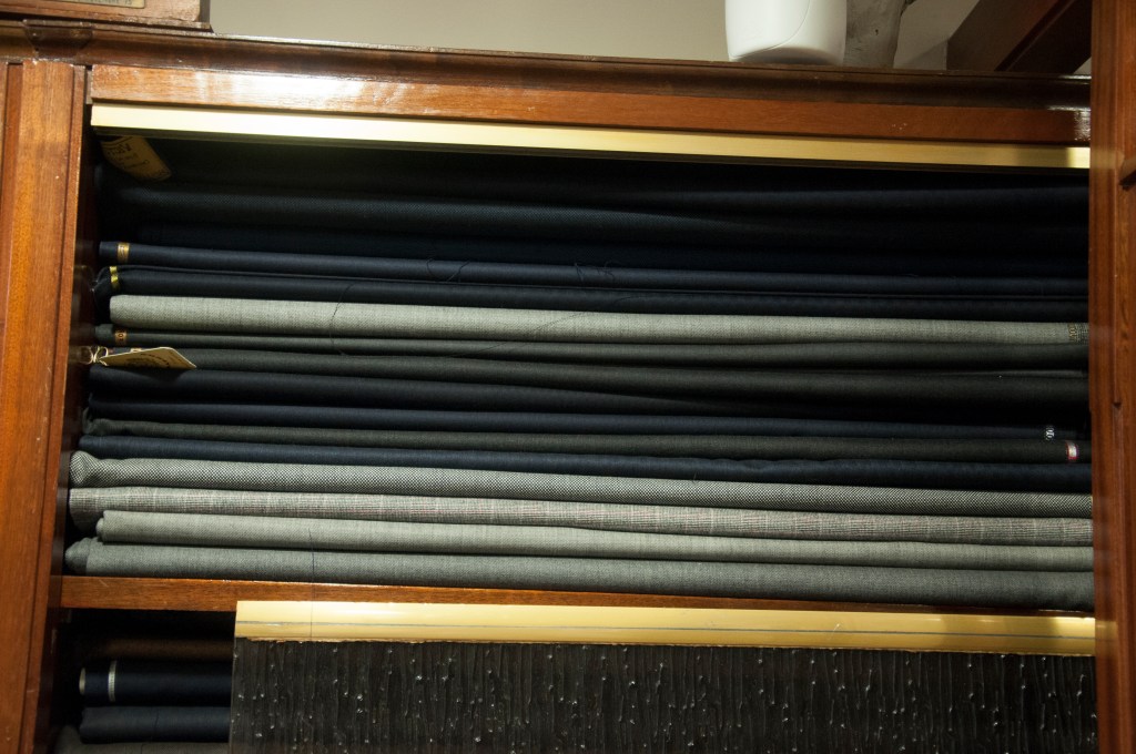 Le choix du tissu marque le début d’une méthode que j’utiliserai souvent ensuite. Alors que nous commençons à sortir les liasses, Roberto me dit qu’il lui reste un coupon d’un tissu natté bleu de la maison Holland & Sherry, magnifique, et pas dans les liasses. Ce tissu a un gros avantage : j’en vois plus qu’un carré de 20×20, et je le choisis rapidement, exactement ce qu’il me fallait. Problème, il y a de quoi faire les 3 pièces, mais pas le second pantalon que je comptais commander. La solution ne tarde pas à apparaître, lorsqu’Enzo me rappelle que je veux un ensemble polyvalent, autant commander un second pantalon gris, pour porter la veste en blazer avec. Magnifique ! Je choisirai un tissu gris de la maison Guabello. Avec les années, il m’est devenu fréquent de privilégier ce que le tailleur a en stock à la boutique plutôt que de choisir sur liasse, cela permet de « se passer le tissu » et de voir comment il rend vraiment à la lumière.