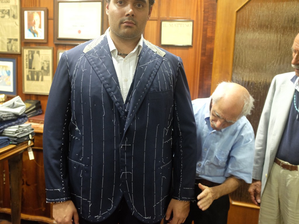 Petite particularité dans mon cas, mon premier essayage correspond en fait au second. En effet, conscient que je vais devoir faire autant d’allers-retours à Naples qu’il y aura d’essayages les Ciardi me proposent de faire comme en trunk show, directement le second essayage (plus avancé en termes de construction) et de revenir pour l’essayage final (où je devrais normalement pouvoir repartir avec mon costume).
