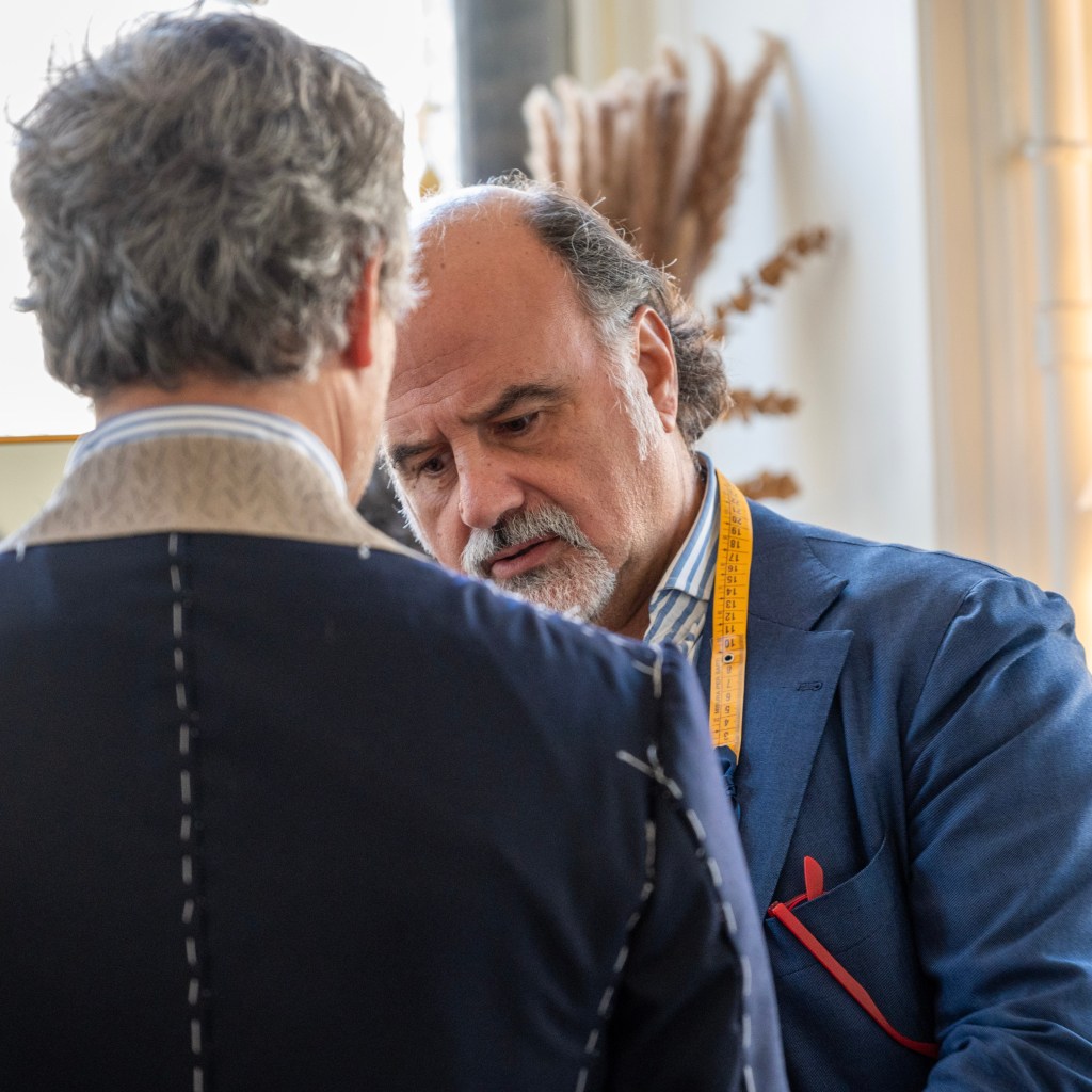 Vient alors le moment tant attendu. Il faut passer la veste. Avec un peu d’aide, n’oublions pas que tout n’est pas cousu. Et les Ciardi me laissent quelques secondes, seul devant le miroir, à observer la première veste réalisée exclusivement pour moi. A mes yeux de profane, c’est parfait. Rarement une pièce ne m’a été aussi bien, c’est fantastique. C’est alors qu’Enzo commence à me tourner autour. Il scrute le moindre détail, vérifie s’il faudrait ajouter retirer quelques millimètres par-ci par-là, vérifie si cette vague dans le tissu vient de la coupe ou juste de l’absence de la doublure qui limite la fluidité. Bref, tout y passe et les quelques, j’allais dire défauts, mais plutôt points d’amélioration sont identifiés. Après ces quelques minutes où Enzo et Roberto discutent de cet ensemble, intervient la cerise sur le gâteau. Leur père, Renato, qui observait l’essayage silencieux jusqu’ici se rapproche, vérifie un point dans le dos, et c’est reparti, faut-il reprendre ici ou pas ? Les échanges vont bon train sur ce qui me semble un point de détail tant cette veste me semble fantastique. Privilège de l’essayage à l’atelier, Enzo demande à la personne qui va reprendre la veste, de monter (oui, chez les Ciardi, comme à Savile Row, la salle de coupe est au sous-sol), ce qui permet de lui montrer exactement la modification qu’ils ont en tête. Chose toujours plus délicate en trunk show.