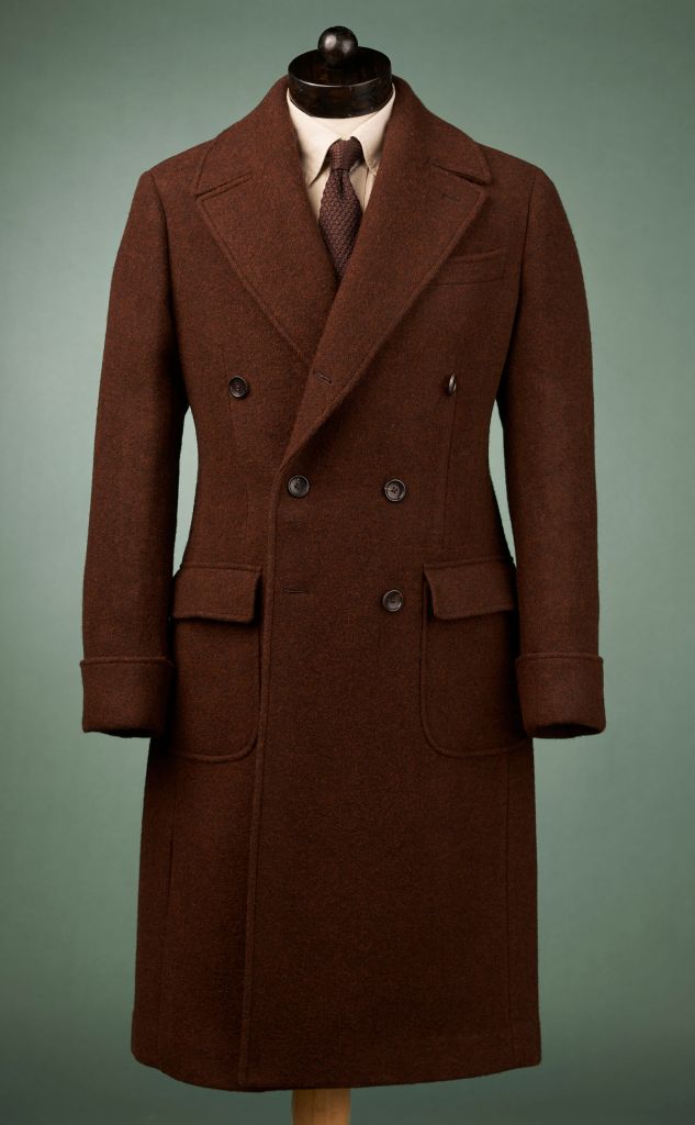 Stylistiquement entre ces deux options, il y a l’ulster coat. Qu’est-ce ? Eh bien prenons un manteau croisé type chesterfield, le plus gros changement c’est le col, au lieu d’un revers à cran aigu, le cran de l’ulster coat, est à l’horizontale, voire tombant, cela donne un côté plus décontracté et, surtout cela permet d’avoir une vraie protection lorsqu’on relève le col du manteau, alors que c’est globalement inutile avec des revers classiques. C’est ce qu’on appelle le col (ou le cran) Ulster. Pour le reste, c’est un mix entre le chesterfield et le polo coat, tout est envisageable, poches à rabat ou plaquées, martingale, revers de manches, c’est un peu le fourre-tout où chaque marque peut se distinguer par ses choix de détails. Historiquement en tweed, on peut choisir une matière un peu moins abrupte, comme pour le chesterfield (la frontière entre un polo coat et un ulster camel est assez imperceptible, si ce n’est le soufflet).