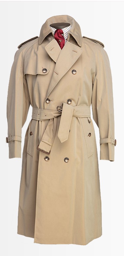 Autre grand classique, indispensable bien sûr, est une pièce plus adaptée aux journées pluvieuses. Le grand classique, selon moi est un manteau inventé par Thomas Burberry en 1914 pour répondre au besoin de l’armée anglaise pour ses officiers dans les tranchées… le trench. Quelques années après avoir inventé un tissage particulièrement serré rendant le tissu en coton ou laine comme imperméable, la gabardine, Thomas Burberry lui trouve donc un usage parfaitement adapté. Le trench est une pièce particulièrement complexe, avec une quantité de détails impressionnante: manches raglan, boutonnage 10 boutons, fausses poches qui sont des ouvertures vers les poches du pantalon, ceinture avec crochets en métal (pour attacher des grenades ou une épée d’officier selon les sources) qu’on n’attache JAMAIS via l’ardillon mais qu’on noue, attache au col pour le maintenir fermé relevé, seconde couche de tissu à l’avant de l’épaule là où on pose un fusil… Bref une vraie pièce d’amateur. Historiquement on le fait en beige/kaki, bleu marine voire noir. C’est un très grand classique, bien long c’est une bonne protection au quotidien qu’on peut rendre encore plus polyvalente avec une doublure en laine amovible. Malheureusement c’est une pièce forte, que tous n’osent pas porter. La version édulcorée est le Macintosh, un imperméable beaucoup plus simple à boutonnage droit et col chemise, je l’ai toujours trouvé d’un ennui particulièrement trop important pour le porter (mais ça reste un grand classique).