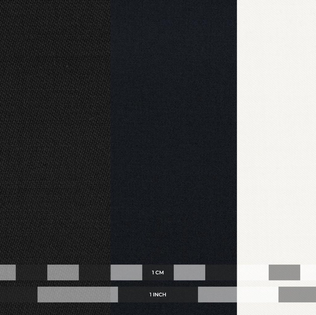 Issus du catalogue Draper’s, 3 tissus barathea : Noir laie/mohair 320g, et bleu nui et écru 100% laine 270g