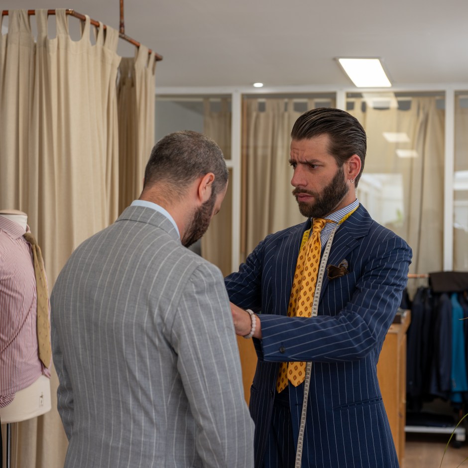 Loin des grands principes immuables (veste obligatoirement longue si tu es petit, bas de pantalon calculé à partir d’un savant calcul entre entre la longueur du fémur et celle du petit orteil gauche…), il décortique ta silhouette dans son ensemble pour adapter les altérations sur son gabarit de base. Concrètement, une même mesure peut varier d’un client à l’autre : prenons le tour de taille, mesure de base. Selon ton physique, on priorisera peut-être un ajout sur les quarts avant de la veste, ou à l’arrière pour l’équilibre parfait. C’est cette somme d’équilibres fins qui forge une pièce qui épouse ton corps comme une seconde peau, et qui met en valeur le porteur.
