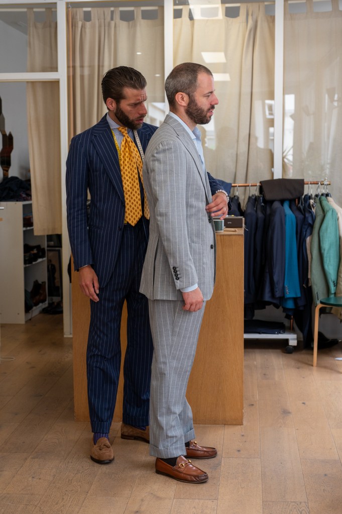 Commençons par la coupe, car c’est elle l’alpha et l’oméga, la raison numéro un de se tourner vers le sur-mesure. Oublie les discours ronflants des vendeurs de tapis qui te vendent « leur » coupe comme un dogme figé en une ribambelle de détails ésotériques, juste pour impressionner le profane. L’approche d’Yves est celle du vrai tailleur : créer un costume qui « va » à son porteur, point final. Qui dissimule les petites particularités physiques considérées comme des défauts tout en mettant en valeur celles considérées comme des atouts.